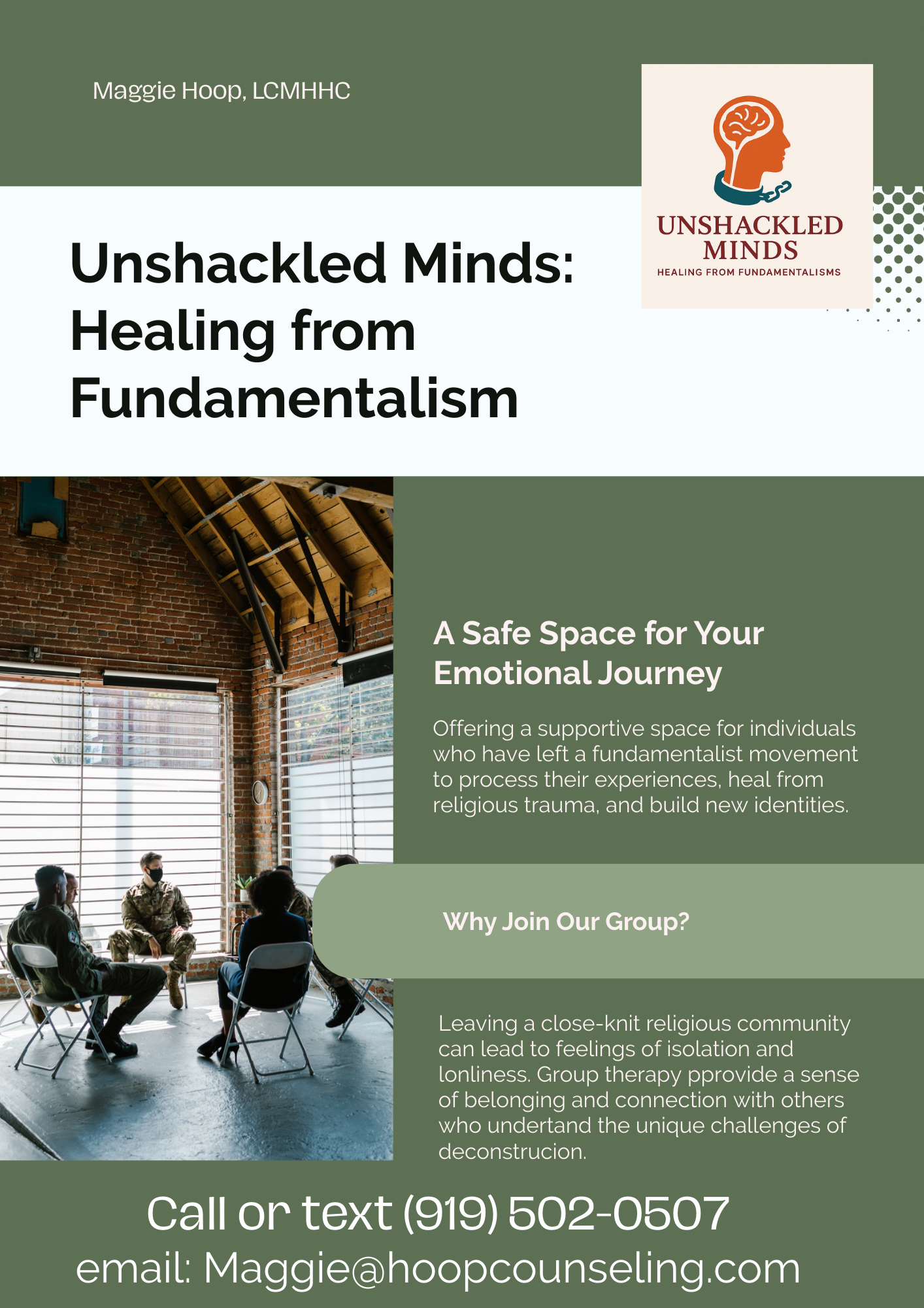 Healing from Religious Trauma: Many individuals leaving the funamentalist movement experience emotional and psychological distress due to the beliefs, practices, and social structures they have left behind. Therapy provides a safe space to process these experiences and begin healing.